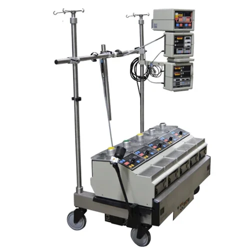 The Terumo Sarns Modular Perfusion System 8000 is a versatile and compact heart-lung machine designed for use in cardiac surgery. The modular design and built-in features of the System 8000 enable the platform to be configured for current and future needs in the field. The modular features of the System 8000 enable the cardiopulmonary bypass pump to be set up in a variety of configurations. The System 8000 is available in a four-pump or a five-pump base with an option for acquiring a built-in centrifugal pump. The Perfusion System 8000 can be configured based on new protocols and individual patient needs. The cardiopulmonary bypass pump's flexibility enables the users to manage a specific case based on the definition of safety connection and responses, the utilization of the Central Control Monitor, and the implementation of the machine's built-in Sarns capabilities. The heart-lung machine also features a state-of-the-art Central Control Monitor. The Central Control Monitor is a high-resolution touchscreen computer designed to be used as a safety monitor and the central interface for operating the machine.