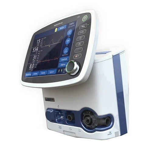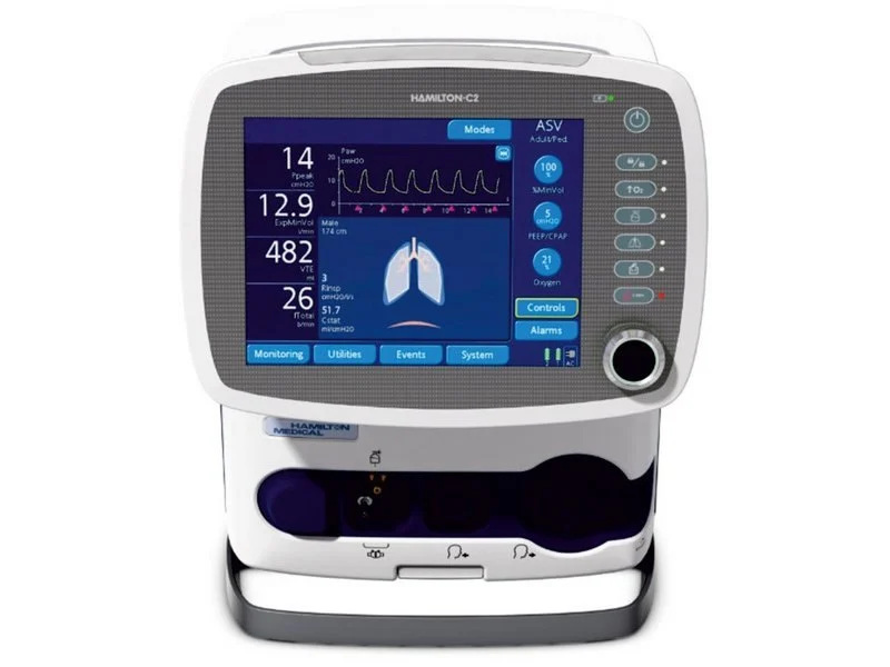 The HAMILTON-C2 mechanical ventilator is a universal ventilation solution for all patient groups. The HAMILTON-C2's compact design and independence from external power and air supplies allow for maximum mobility throughout the hospital. The integrated high-performance turbine guarantees top performance even with noninvasive ventilation.